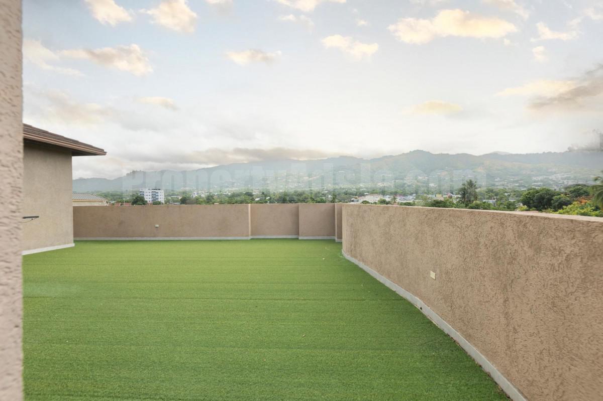 Located in Barbican, Kingston 6, here is a luxurious 3-bedroom, 3.5-bathroom split-level penthouse spanning nearly 5,000 sq ft with breathtaking city views. Features include a spacious, easy-to-clean kitchen with island and farmhouse sink, a huge Primary Suite with jetted tub, shower stall, and bonus space for a closet or mini office. Two bedrooms are upstairs, one on the entry level. Enjoy a massive turf-covered outdoor terrace perfect for entertaining or relaxing. Located in a secure complex with 24-hour security and a pool. Ideal for upscale living and stylish comfort.