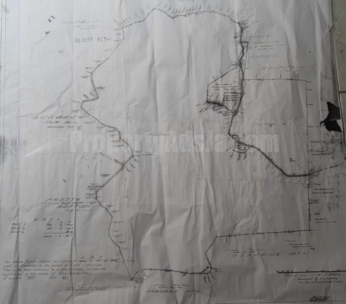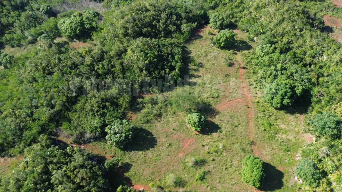 19,340,640 sq ft/444 acres of relatively flat land for sale. The property is located in Guanaboa Vale, St Catherine in a district called Dover. It is roughly 15-20 minutes drive from Bushy Park or Jamaica Broilers Best Dress Chicken, in Spring Village, Old Harbour. The land is presently undeveloped and has a considerable amount of fruit trees like mango, cashew etc and some amount of shrubs. This property was formally used as a private estate. It take about 3 minutes drive from the main road before entering the property and once on the property, It is possible to drive about half mile into the land via an incomplete road infrastructure. Jps power in located within very close proximity to the land. A river forms the East boundary of the property.